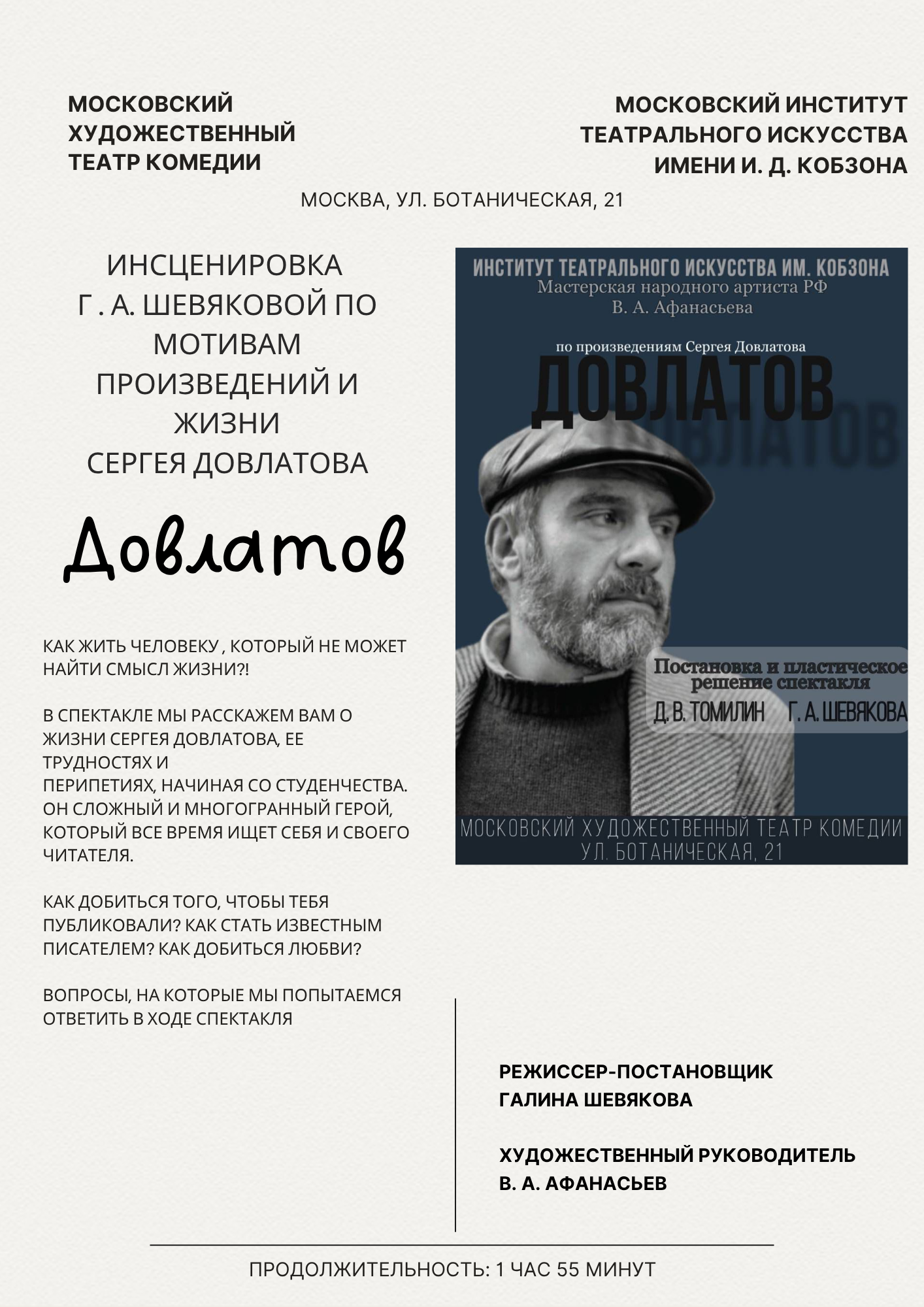 Погрузитесь в атмосферу его ироничной, остроумной и пронзительной прозы. Спектакль, поставленный Галиной Шевяковой, исследует вечные темы: внутренняя свобода, горькая слава «невостребованного гения» и трагедия мыслящего человека в мире абсурда. Вы увидите ожившие рассказы из «Зоны», «Компромисса», «Чемодана» и услышите голос писателя, который, уехав в Америку, покорил даже журнал The New Yorker.