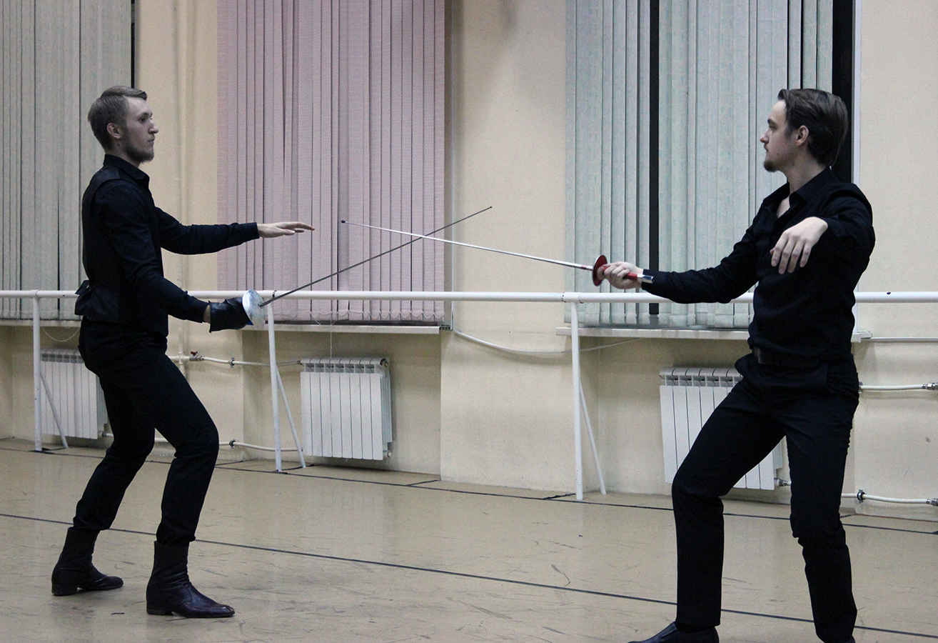 В отличие от спортивного, сценическое фехтование не требует защитную экипировку. Поэтому особое внимание уделяется технике безопасности. Здесь от партнеров требуется безошибочно четкое выполнение действия. На этот раз у ребят неплохо получилось. Никто никого не уколол! Все целы и невредимы!
